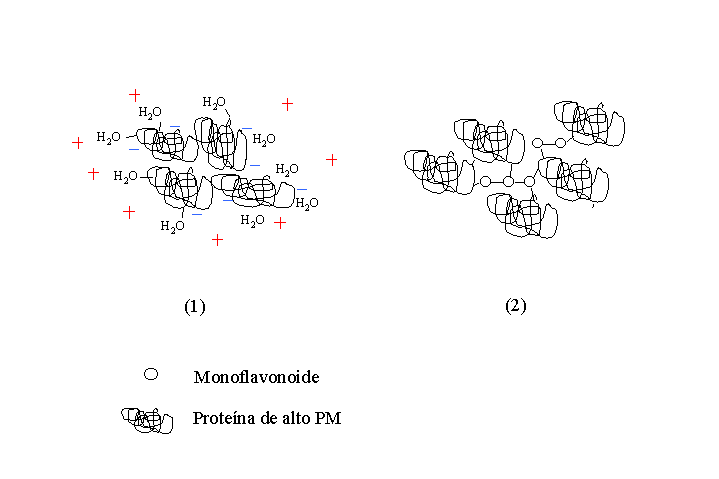 2- Ejemplo de un coágulo con proteínas, dímero y trímero de flavonoide, en el punto isoelétrico y deshidratado (en el hervor).